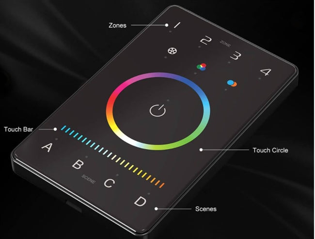 Designed with both performance and aesthetics in mind, the Intelligent Touch Panel features a CNC aviation-grade aluminum frame paired with a 2.5D tempered glass touch surface for a refined, modern appearance. The intuitive touch interface allows users to seamlessly adjust color output, brightness, and scene settings across multiple zones. When paired with Bluetooth-based lighting systems, the panel delivers enhanced convenience, flexible configuration, and reliable control for sophisticated lighting designs.